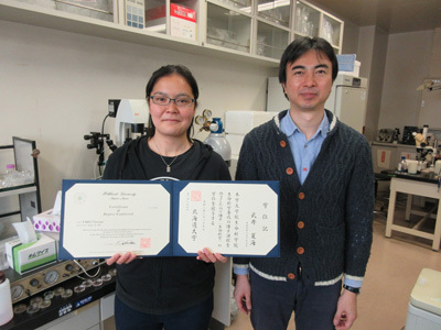 2020年 研究室メンバーです。 2021年3月20日 日本動物学会・北海道支部大会(オンライン開催)で佐藤圭祐君が優秀発表賞を受賞しました。表彰状と一緒に記念撮影です。 2021年3月25日 北海道大学卒業式の日です。武井さんが博士課程を修了しました。学位記ともに。おめでとうございます。 2021年3月25日 酒井さんが学部を卒業しました。おめでとうございます。