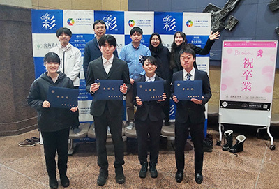 2024年 研究室メンバーです。 2025年3月25日 北海道大学卒業式の日でした。佐藤君が博士課程を、杉西さんが修士課程を修了し、池原さんと斉藤君が学部を卒業しました。研究室メンバーと、学位記とともに。おめでとうございます。