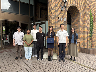 2025年9月25日 学位記授与式の日でした。Fierro さんが博士課程を修了しました。研究室メンバーと、学位記とともに。おめでとうございます。