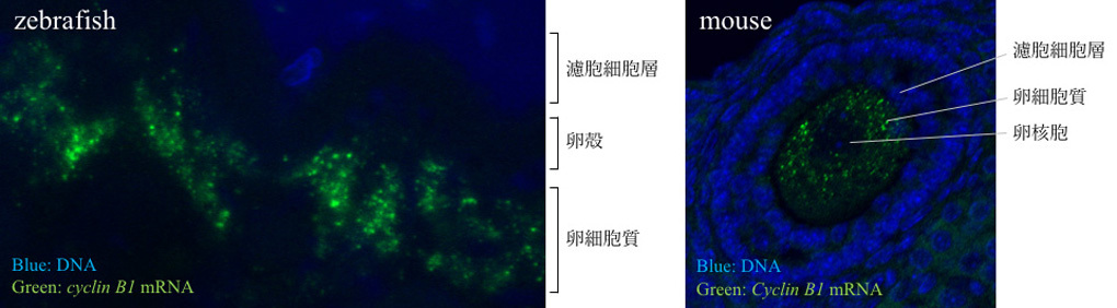 図2. ゼブラフィッシュとマウス卵母細胞における cyclin B1 mRNA の分布