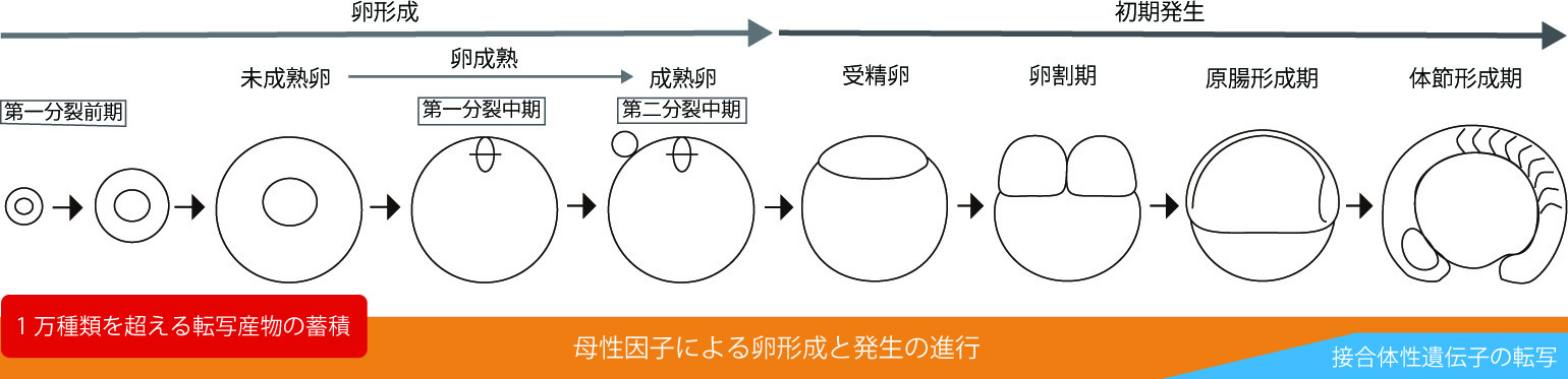 卵母細胞はその形成過程(卵形成; 図1)で1万種類を超える転写産物を蓄えます。これら転写産物を含め、卵母細胞に蓄えられる因子を母性因子と呼びます。卵形成は古くから形態学的に、あるいは生化学的に解析されてきました。しかし、1万種類を超える母性因子がどのように卵母細胞に蓄えられるのか、これら因子はどのように生物の誕生を可能にし、個体を形作っていくのか、これら多くの疑問は未解明のままです。ゼブラフィッシュは飼育が容易で世代交代にかかる期間が短いため、遺伝学的解析に適しています。これまでにゼブラフィッシュを用いた大規模な母性効果変異体のスクリーニングが行われ、卵形成と初期発生に重要な数十種類の母性因子が見出されました。これらの研究から、母性因子は受精とその後の初期発生を進行させるために、想像を超えて多くの役割を持つことが分かってきました。しかし、今までの母性効果変異体は化学変異原によって作出されています。これは、変異体の解析を困難なものとしています。私たちは化学変異原ではなく、動く遺伝子、トランスポゾンを利用し母性効果変異体を作製しています。そのスクリーニングによって、魚類から哺乳類まで高度に保存された新規遺伝子を同定し、そのタンパク質が初期発生における細胞の相互作用と体節形成、さらにヘッジホッグシグナルの遺伝子発現に重要であることを見出しました (Kotani and Kawakami, 2008; Kotani et al., 2010; Kotani, 2012)。このタンパク質の機能解析によって、体節形成の新たな仕組みも明らかとなってきました。現在、新たにスクリーニングを実施し、新規母性因子の同定とその機能解析を行なっています。その解析は、動物の個体を作り出す仕組みの解明になります。